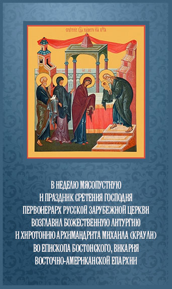 Джорданвилль (Нью-Йорк): В Неделю мясопустную и праздник Сретения Господня Первоиерарх Русской Зарубежной Церкви возглавил Божественную литургию и хиротонию архимандрита Михаила (Краули) во епископа Бостонского, викария Восточно-Американской епархии